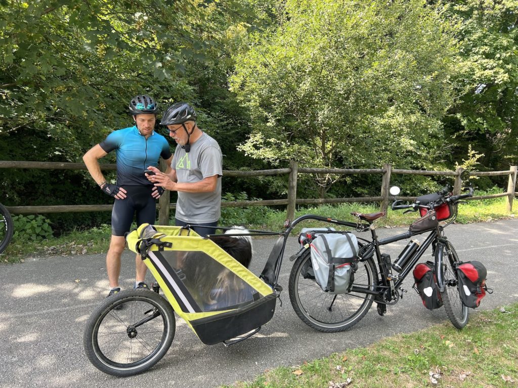 Une trentaine de km plus loin, à la sortie du rond-point d’Ugine au bord de la rivière L’Arly, nous croisons un cyclovoyageur, Dani, et son petit Shetland confortablement installé dans la remorque. S’ensuit un super moment de rencontre ponctué par les mille anecdotes dont recèle Dani, sur ses riches années de voyage à vélo avec son petit compagnon.