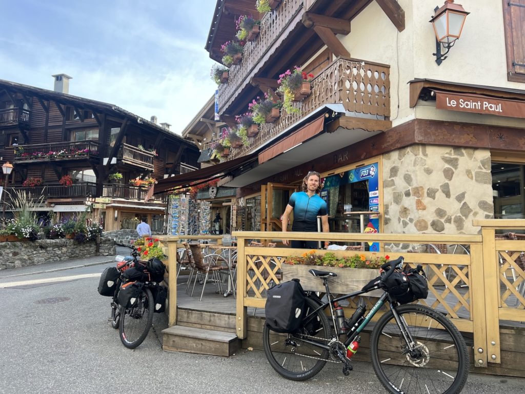 Après la nuit la plus confortable et certainement le meilleur petit-déjeuner de notre première semaine, le coup dur de la veille est bien loin et c’est pleinement requinqués que nous enfourchons à nouveau nos vélos. Plusieurs choix d’itinéraires étaient possibles mais nous nous étions donné comme règle de suivre les signes que nous rencontrerions tout au long du voyage. Et le signe que nous attendions était là: deux jeunes motards allemands rencontrés la veille sillonnaient la route des Grandes Alpes et nous ont vanté les magnifiques cols traversés (Col de l’Iseran, Col du Galibier, et bien d’autres dont nous avait aussi parlé le papa de Pierrick). C’était donc parti pour la route la plus difficile des itinéraires possibles mais aussi certainement la plus belle. Nous avions aussi hâte de retrouver nos chères montagnes!