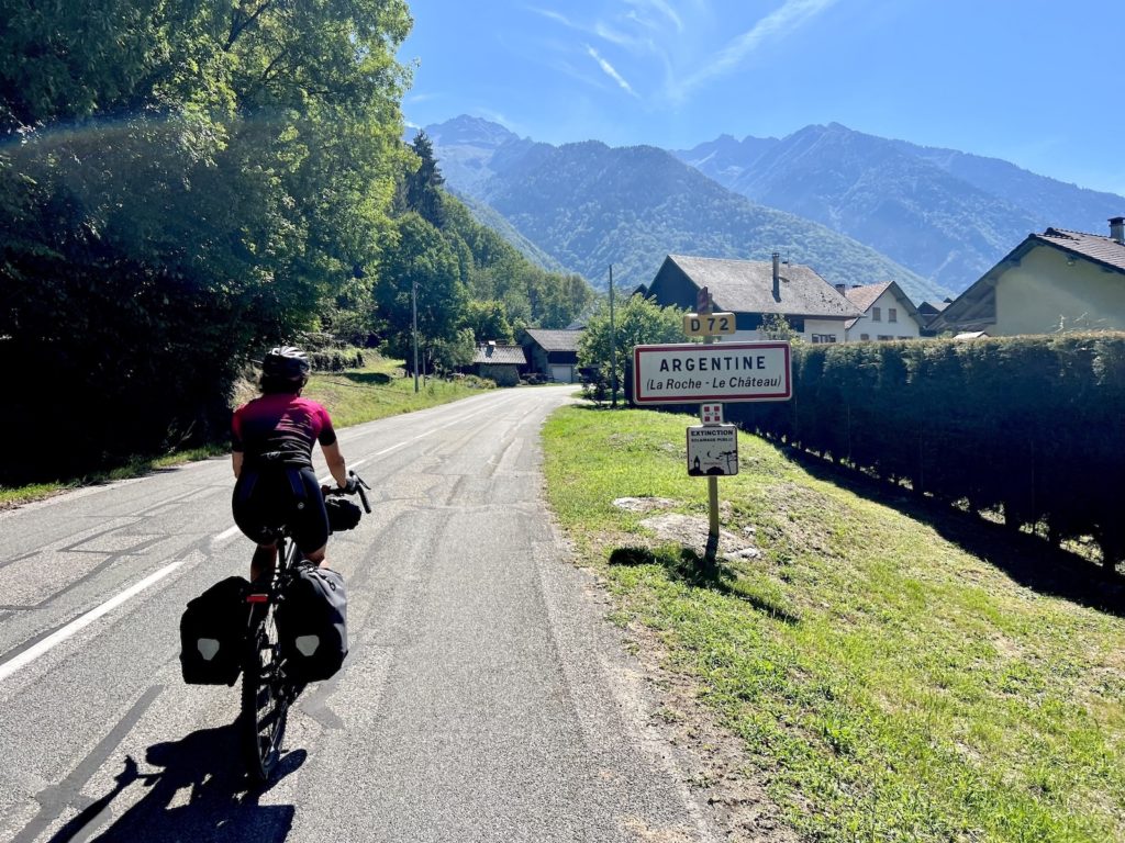 On longe l’Arly sur une piste cyclable un long moment, avec le bruit de l’autoroute en fond. Si pour Dani ce bruit est complètement rebutant, je veux bien en faire abstraction tant qu’on est physiquement loin des voitures! Albertville commençait gentiment à apparaître au loin. J’étais encore trop jeune pour m’en souvenir mais Pierrick m’a raconté que cette ville était connue pour avoir accueilli les jeux d’olympiques d’hiver en 1992. J’étais bien curieuse de découvrir cet endroit mais, une fois sur place, je garde malheureusement le souvenir d’un lieu pas particulièrement accueillant. La faute à notre arrivée un dimanche, peut-être ? Les rues étaient désertes et les locaux nous regardaient sans sourire ni ciller. Habitués à une attitude très bienveillante des gens jusqu’ici, nous n’avions qu’une envie, trouver de quoi manger et reprendre rapidement la route. C’était sans hésiter le premier coup dur du voyage, ces moments où tu te demandes ce que diable tu fais ici. Après des salades achetées et mangées sur le pouce au bord de la route, nous sentons que le réconfort d’un gîte serait bienvenu. Et c’était parti pour une recherche mêlant noms de gîte et profils de route, n’ayant plus l’énergie de faire de gros kilomètres à cette heure de la journée.